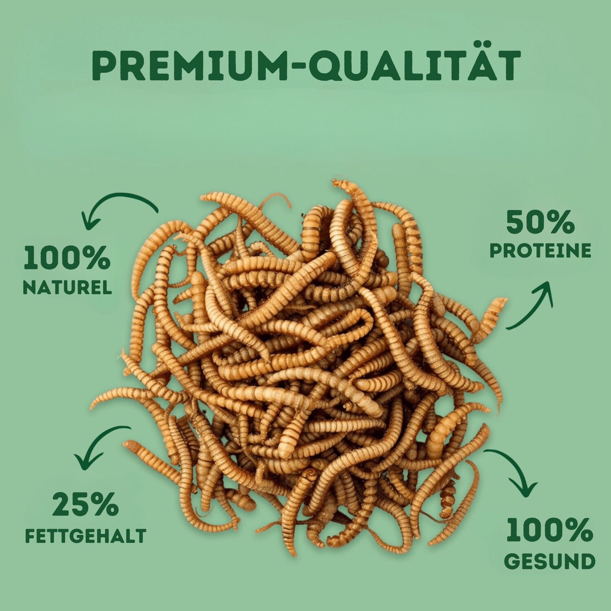 Wormm’en sind Proteinpakete. Mit einem Proteingehalt von 50%, einer Vielzahl von Vitaminen, gesunden Fetten, Mineralien und Antioxidantien sind Mehlwürmer ein Gourmet-Menü für deine Haustiere. Reptilien, Vögel und Schildkröten lieben sie.